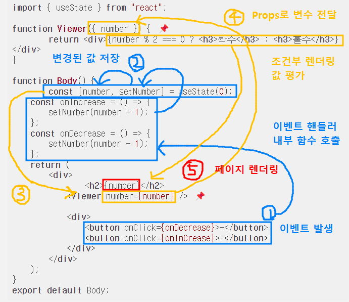 - Viewer 컴포넌트를 선언한다. 이 컴포넌트에는 Props로 Body 컴포넌트에 있는 State 변수 number가 전달된다.