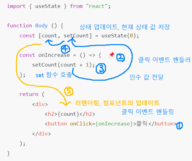 - 버튼의 이벤트 핸들러 onIncrease에서는 set 함수인 setCount를 호출한다. 인수로 count에 1 더한 값을 전달한다.