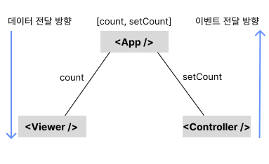 리액트에서 컴포넌트 간에 데이터를 전달할 때는 Props를 사용하는데 전달 방향은 언제나 부모로부터 자식에게 전달하는 방식이다. 리액트의 이러한 데이터 전달 특징을 '단방향 데이터 흐름'이라고 한다. 반면 State를 변경하는 이벤트는 자식에게 부모를 향해 역방향으로 전달되어야 한다.